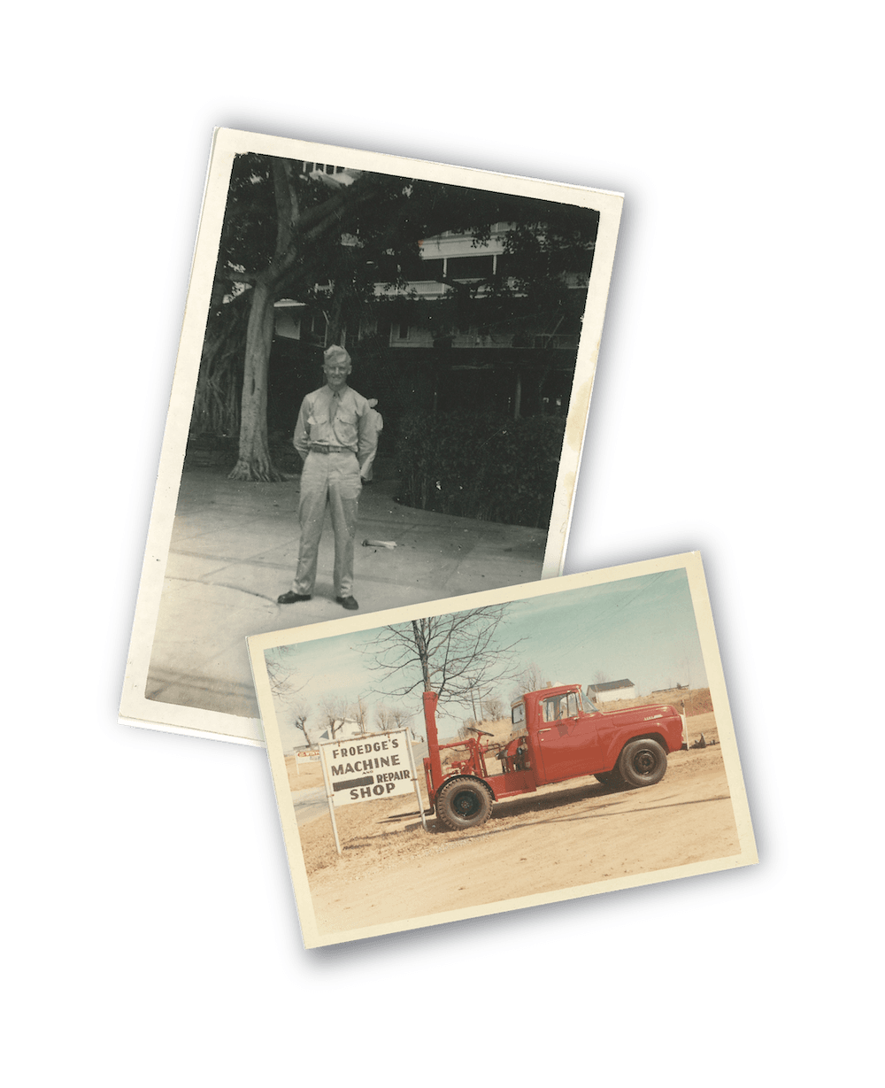 Wendall Froedge started the company in 1962 as a watch repair shop, and slowly began adding other services, such as machining, industrial, and automotive supply. With previous experience as a farmer, jeweler, machinist, soldier, and agricultural salesman, Wendall drew from a broad set of talent and experiences and a deep understanding of customer needs.